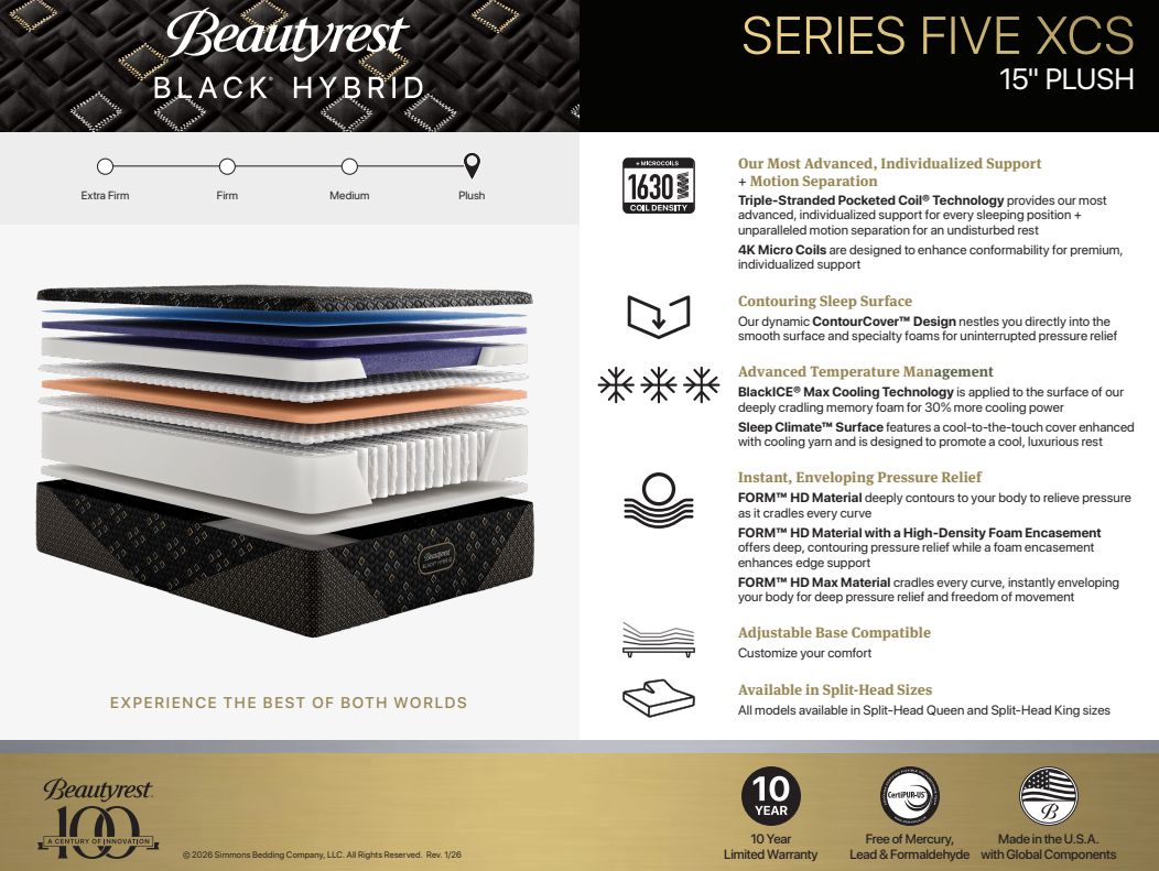 The XCS series is the pinnacle of luxury, offering unsurpassed durability, support, and comfort. The Beautyrest Black® Hybrid Series 5 XCS Plush Mattress combines advanced pocketed coil technology with premium foams to deliver individualized support and exceptional motion isolation. FORM™ HD Material contours precisely to your body's unique shape, cradling curves while maintaining freedom of movement. BlackICE® Max Cooling Technology enhances heat dissipation by 30%, ensuring you stay cool throughout the night. The ContourCover™ features a cool-to-the-touch surface for immediate comfort. This hybrid design unites the responsive support of Triple-Stranded Pocketed Coil® Technology with specialty foams, creating a restorative sleep surface that adapts to your needs while minimizing partner disturbance.