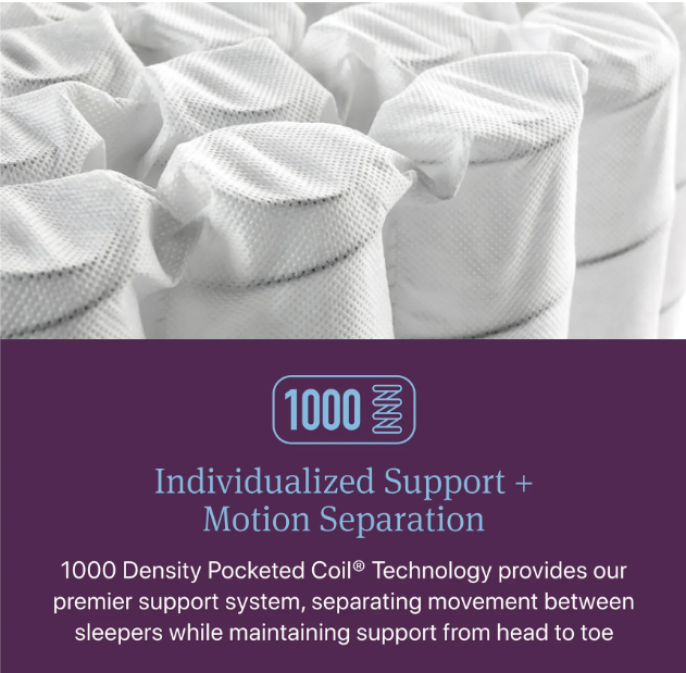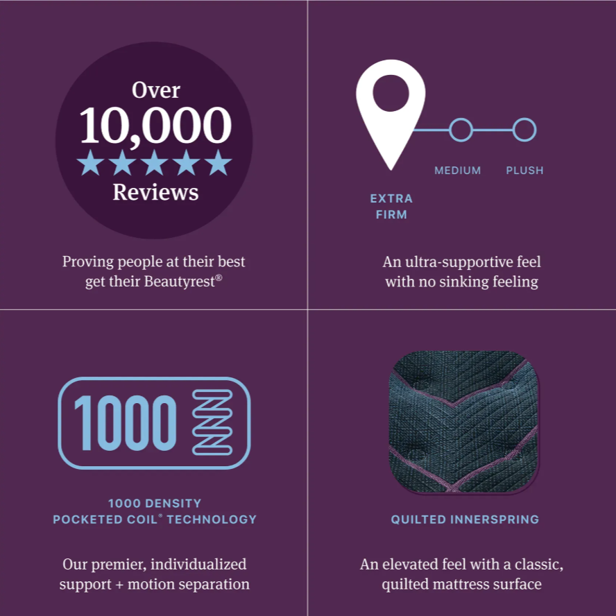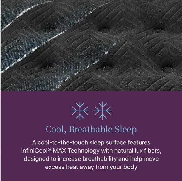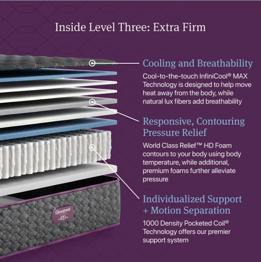 Experience a top-tier sleep with Beautyrest World Class. Featuring Beautyrest's 1000-density Pocketed Coil Technology and higher-density foams, this mattress delivers exceptional support and motion separation. The new World Class Relief HD Foam, found in all Level Four mattresses, offers outstanding pressure relief that adapts to your body. Additionally, Level Four mattresses incorporate double the SurfaceTouch Gel Memory Foam, enhancing pressure relief at the surface. InfiniCool MAX Technology provides advanced cooling through vertical cooling fibers in Beautyrest's World Class Quilted mattresses.